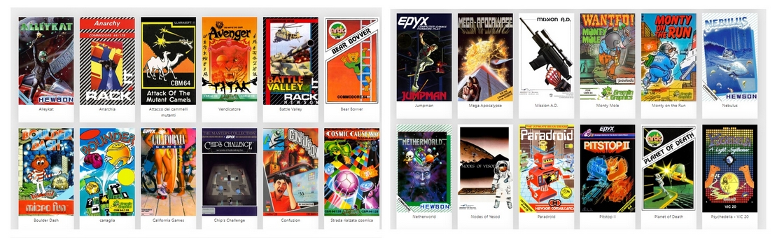 Alleykat, Anarchy, Attack of the Mutant Camels, Avenger, Battle Valley, Bear Bovver, Boulder Dash, Bounder, California Games, Chips Challenge, Confuzion, Cosmic Causeway, Cyberdyne Warrior, Cybernoid II, Deflektor, Destroyer, Everyone's a Wally, Firelord, Galencia, Gateway to Apshai, Gribbly's Day Out, Gridrunner (VIC 20), Heartland, Herobotix, Highway Encounter, Hover Bovver, Impossible Mission, Impossible Mission II, IO, Iridis Alpha, Jumpman, Mega Apocalypse, Mission AD, Monty Mole, Monty in fuga, Nebulus, Netherworld, Nodi di Yesod, Paradroid, Pitstop II, Planet of Death, Psychedelia (VIC 20), Ranarama, Robin of the Wood, Silicon Warrior, Skate Crazy, Speedball 2, Spindizzy, Steel, Street Sports Baseball , Street Sports Basketball, Summer Games II (include eventi Summer Games), Super Cycle, Sword of Fargoal, Temple of Apshai Trilogy,The Arc of Yesod, Thing Bounces Back, Thing on a Spring, Trailblazer, Uridium, Chi osa vince II, Giochi invernali, Giochi mondiali, Zynap
