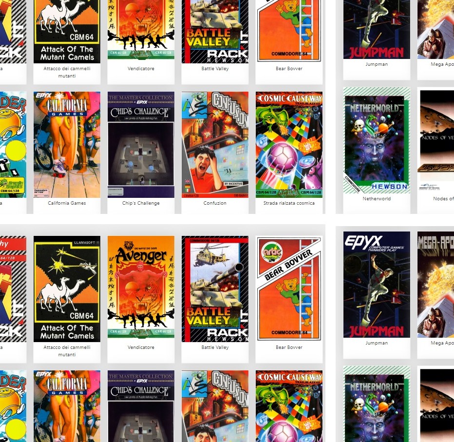 Alleykat, Anarchy, Attack of the Mutant Camels, Avenger, Battle Valley, Bear Bovver, Boulder Dash, Bounder, California Games, Chips Challenge, Confuzion, Cosmic Causeway, Cyberdyne Warrior, Cybernoid II, Deflektor, Destroyer, Everyone's a Wally, Firelord, Galencia, Gateway to Apshai, Gribbly's Day Out, Gridrunner (VIC 20), Heartland, Herobotix, Highway Encounter, Hover Bovver, Impossible Mission, Impossible Mission II, IO, Iridis Alpha, Jumpman, Mega Apocalypse, Mission AD, Monty Mole, Monty in fuga, Nebulus, Netherworld, Nodi di Yesod, Paradroid, Pitstop II, Planet of Death, Psychedelia (VIC 20), Ranarama, Robin of the Wood, Silicon Warrior, Skate Crazy, Speedball 2, Spindizzy, Steel, Street Sports Baseball , Street Sports Basketball, Summer Games II (include eventi Summer Games), Super Cycle, Sword of Fargoal, Temple of Apshai Trilogy,The Arc of Yesod, Thing Bounces Back, Thing on a Spring, Trailblazer, Uridium, Chi osa vince II, Giochi invernali, Giochi mondiali, Zynap